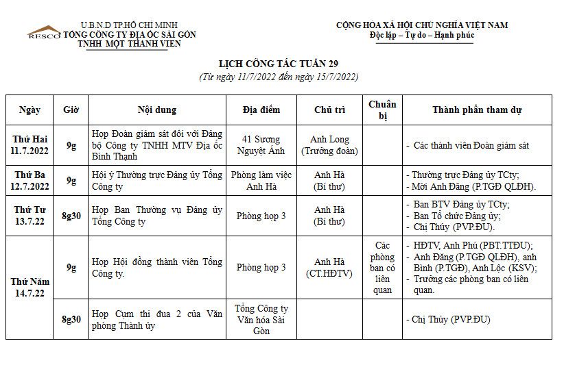 Lịch công tác tuần 29 (Từ ngày 11/7/2022 đến ngày 15/7/2022)