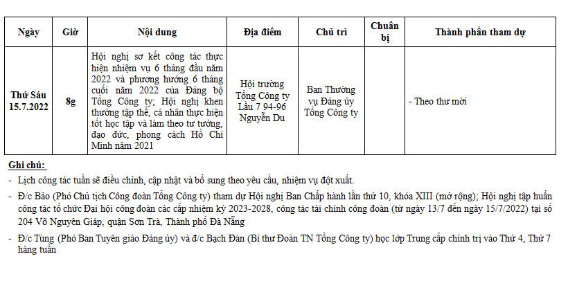 3. Lịch công tác tuần 29 (Từ ngày 11/7/2022 đến ngày 15/7/2022)
